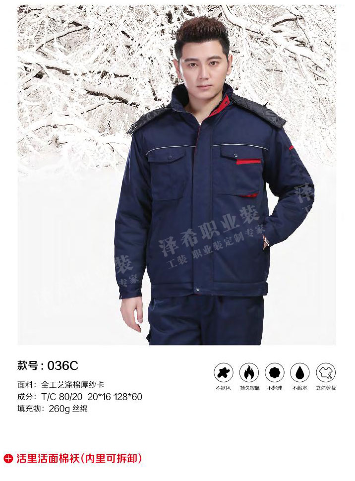 名称:活里活面可拆卸棉服 面料:全工艺涤棉厚纱卡 特点:舒适 耐磨 不起球 不掉色 大连泽希服装服饰有限责任公司 专业设计制作工作服,职业装,酒店服装,承接各大企业的工作服,职业装加工,订制,为您量身打造舒服,合适的工作服装。公司坚持质量第一,信誉第一,服务第一的经营理念,以合理的价格,优质的服务为您增添职场风采。